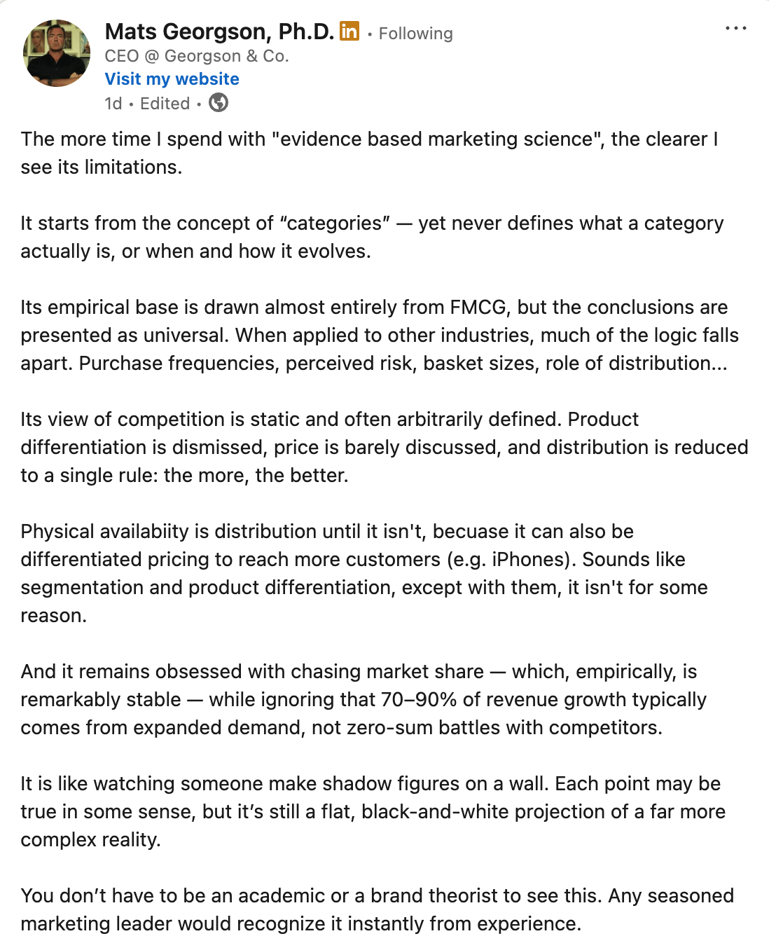 Para produtos que de alguma forma são ancorados na performance, nenhum endosso de celebridade vai ser tão persuasivo como o de uma comunidade vibrante de entendidos e entusiastas, sejam eles foodies, audiófilos, nerds do café e assim por diante. Mesmo o papel dos criadores de conteúdo é outro: é o nível de envolvimento pessoal e o conhecimento técnico que transmitem credibilidade e autoridade, não o alcance bruto - que pode ser até um fator de desconfiança em alguns casos. O “pedágio” para entrar nesse mundo é impressionar clientes do mundo real com muito repertório ou interesse - uma minoria destes possivelmente com uma audiência própria. Eles é que vão avaliar a credibilidade dos seus claims e ajudar a formar a opinião de outras pessoas procurando orientação.